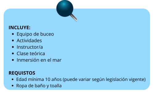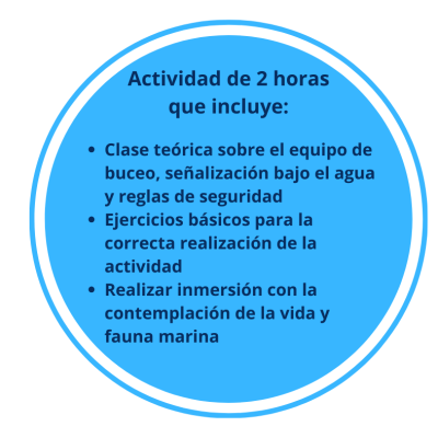 Tendrás tu primera conexión con el fondo del mar y aprenderás conceptos básicos para disfrutar de la experiencia y tener buenas sensaciones. Bucear y respirar bajo el agua es una sensación increíble, además podrás descubrir las criaturas y la fauna submarina realizando este maravilloso deporte.